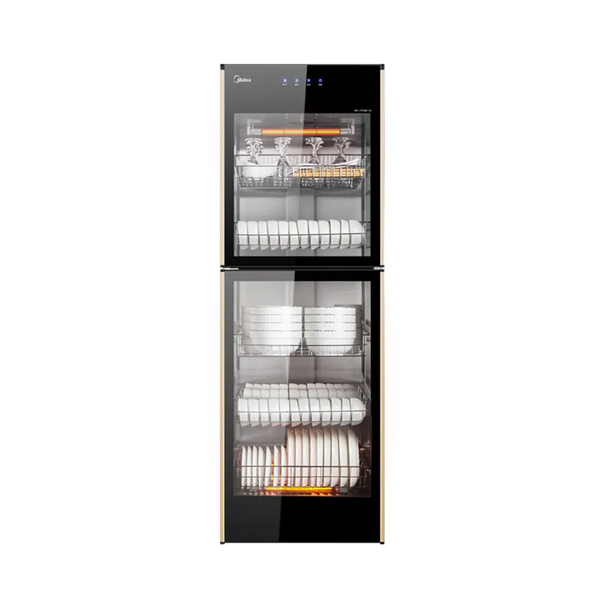 热风循环烘干;臭氧+紫外线立体杀菌;精美外观