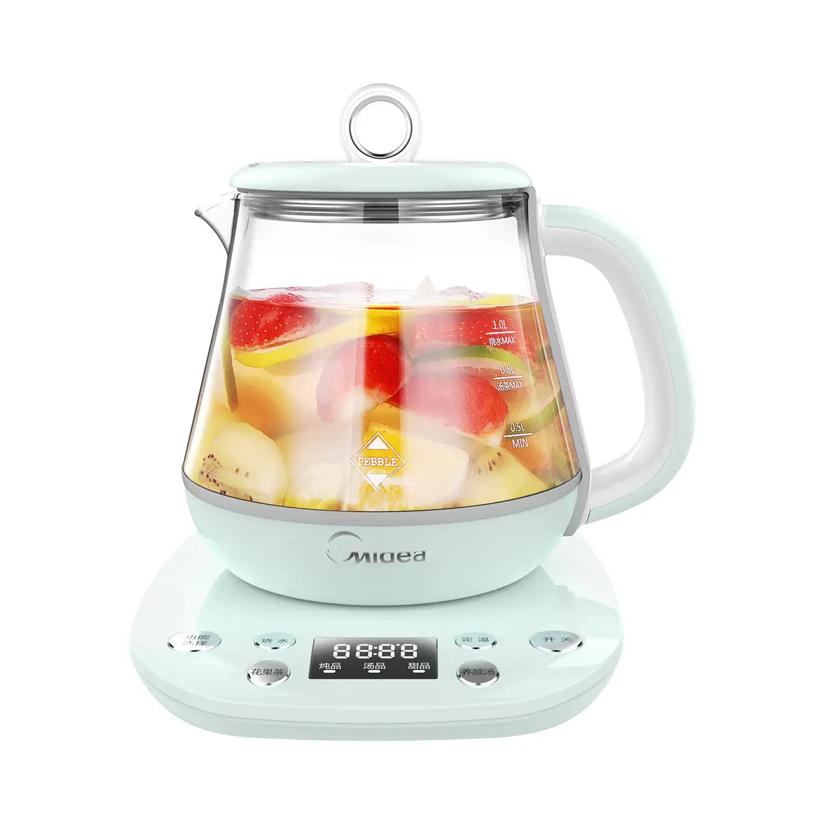 1、1.0L小容量1人份设计2、盖中盖设计,广口上提升茶漏3、镭雕按键设计4、6大养生功能