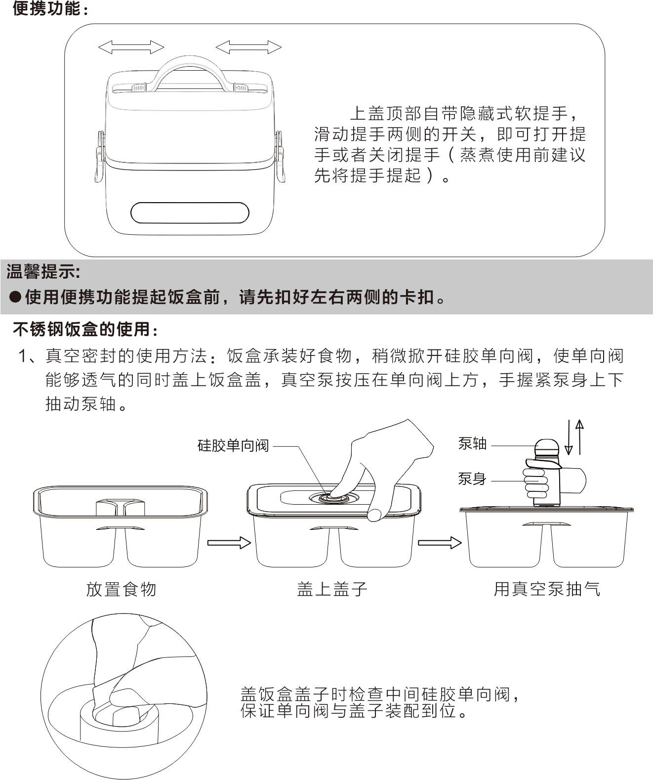 清洗时请勿将机器浸入水中或让液体流入电热饭盒内部,以免发生危险!