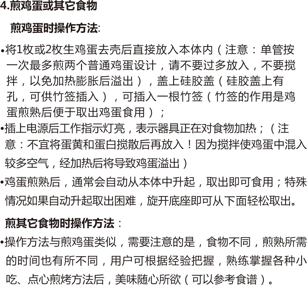 本体中最多只能放入两个去壳生鸡蛋(不要搅拌),或相同体积的其它食物,易膨胀的食物最多只放半筒,如果放入食物过多,加热后可能会膨胀溢出