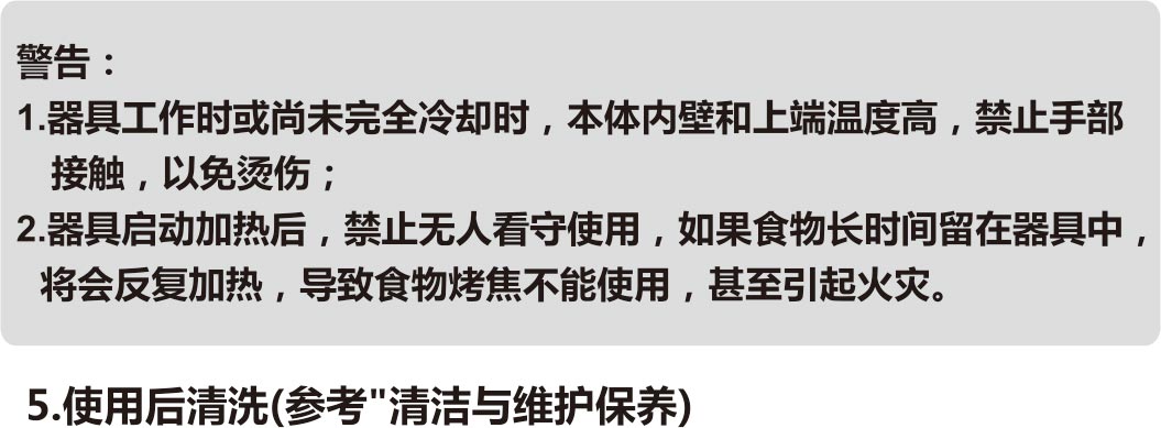 产品工作中或工作完毕未完全冷却前,不能用手触摸本体上端五金表面和加热筒,防止烫伤