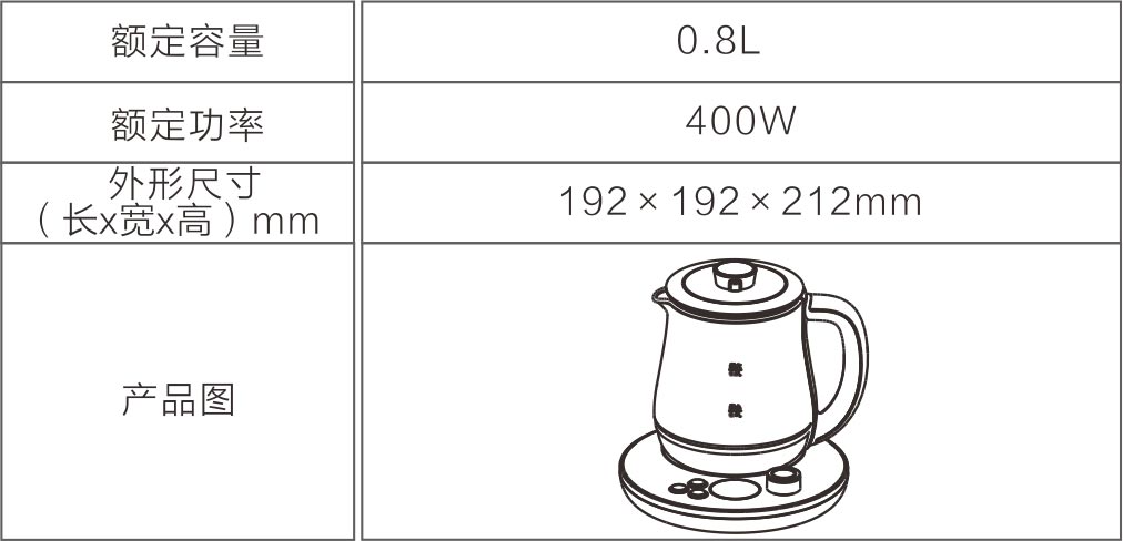 随产品附带的电源底座只用于本产品使用,切勿作其它用途,首次使用本产品,应注水至最高水位,沸腾后倒掉并用冷水冲洗,重复操作二次;