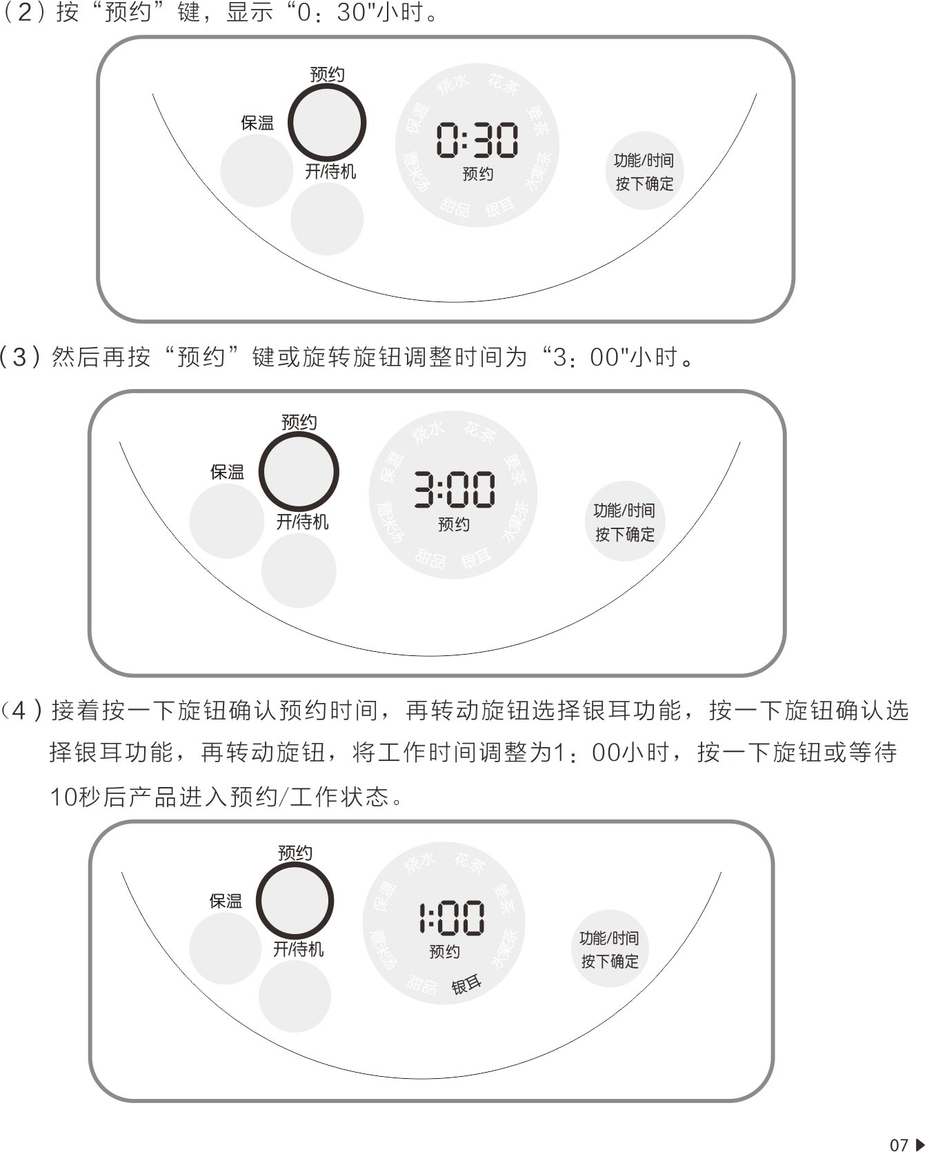 感谢您选用我公司生产的电热水壶(养生壶)系列产品,时尚外观,精致工艺,使用安全可靠,微电脑控制温度,时间及工作状态,带预约功能,功能细分,使用方便,有烧水、花茶、姜茶、水果茶、银耳、甜品、薏米汤和保温功能。时尚外观,精致工艺;微电脑控制,带预约功能;具有防干烧,过热断电保护功能;具有烧水、花茶、姜茶、水果茶、银耳、甜品、薏米汤和保温功能;采用发热盘发热,水即将烧开后功率减半,达到省电效果;产品采用分离式结构设计,拿开产品,电路程序有记忆功能;SUS304不锈钢滤网,优质不锈钢材质。