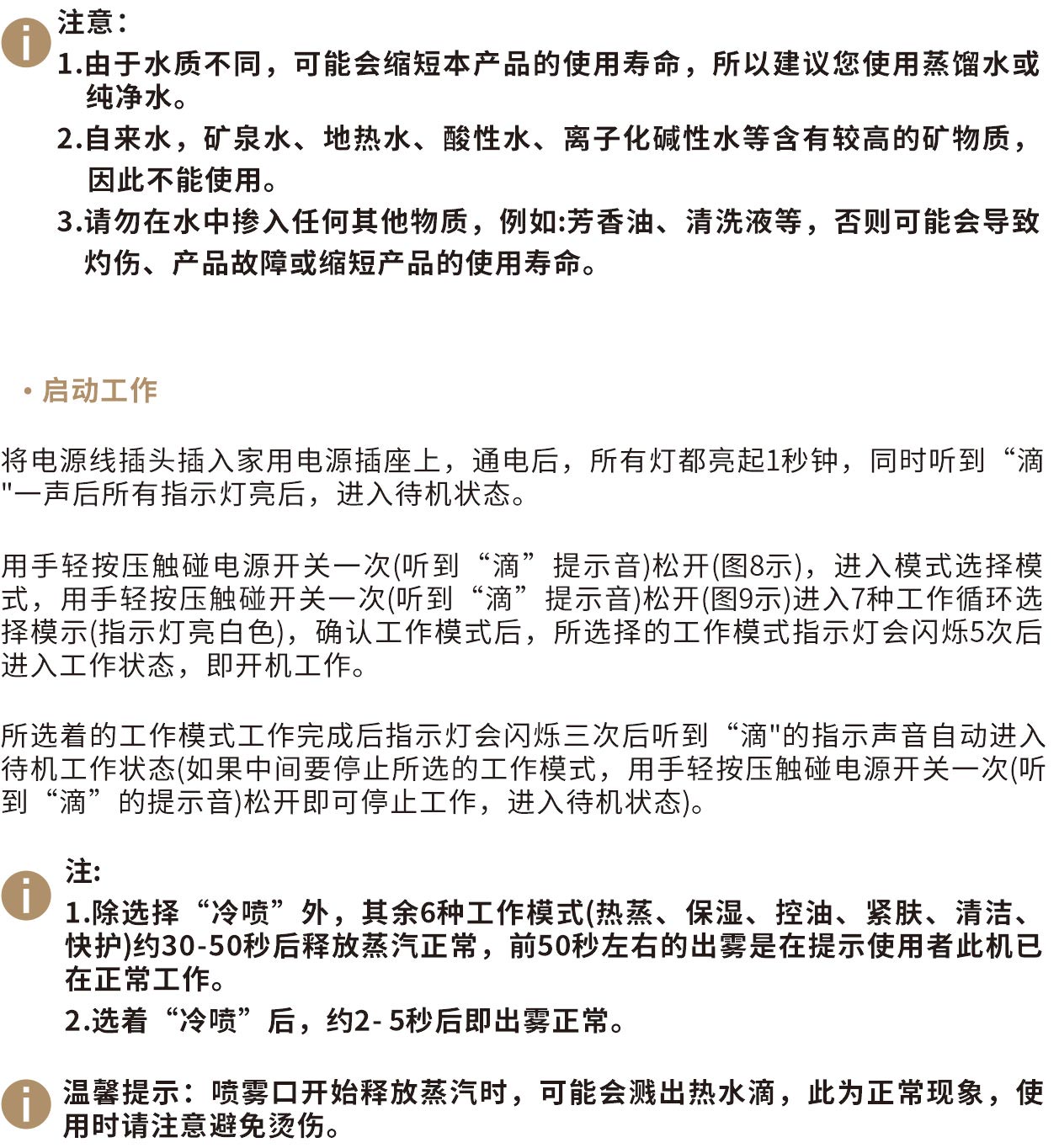 仅使用蒸馏水或纯净水,否则喷出的蒸汽会有异味,甚至可能导致设备故障,严重时可能导致烫伤。