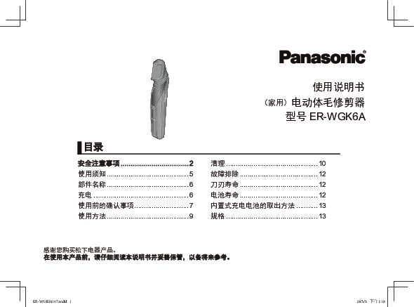 松下Panasonic 【电动体毛修剪器】ER-WGK6A使用说明书