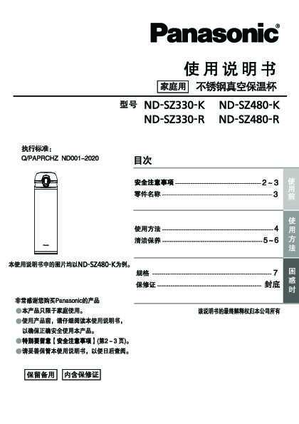 松下Panasonic 【不绣钢真空保湿杯】ND-SZ330、ND-SZ480使用说明书