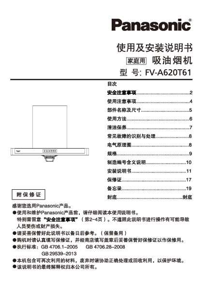 松下Panasonic 【油烟机】FV-A620T61使用说明书