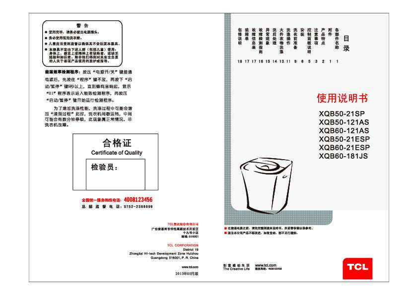 TCL XQB60-181JS 产品说明书 产品说明书